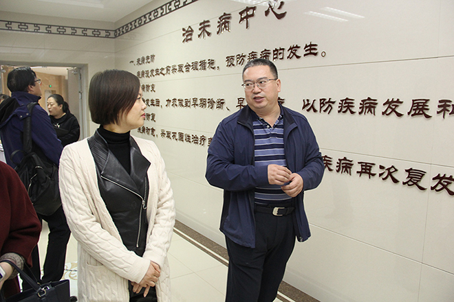 当来到治未病中心时,这里的中医氛围深深地吸引了他们,“知己、求己、求医”的全新的治未病理念让他们为之惊叹。随后来到6楼的康复科、9楼的脑病科和13楼的实训中心进行了参观。孙院长全程对各科室的特色、规划、管理等方面都进行了详细的介绍。