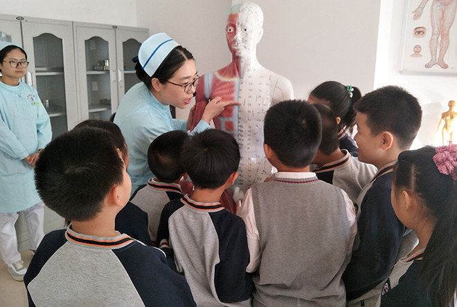 随后孩子们乘坐电梯来到13楼实训中心,走进中药实训室,在药剂师的介绍下认识了生活中常见的中草药,品尝了药食同源的中药;走进中医护理实训室,了解了中医护理与西医护理的不同,规范学习了眼保健操的做法以及一些日常保健穴位;走进中医医师实训室,观摩了医生对实验假人实施心肺复苏、人工呼吸、海姆立克的急救全程,并尝试体验了其中的环节。另外红桃视频 还为年龄偏小的孩子们准备了听触诊多媒体仪器的体验,孩子们也过了一把当小大夫的瘾。