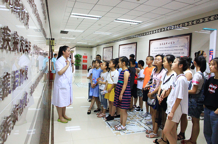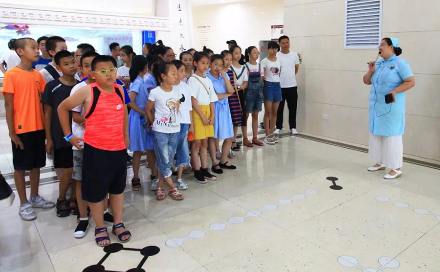 走进红桃视频 一楼门诊大厅,便会看到醒目的地标图,从中医角度寓意着生命的起源。讲解员告诉同学们,人生于地,悬命于天,天地合气,命之曰人。古人认为天圆地方,契合此图外圆内方,图中生命万物皆包含于此。