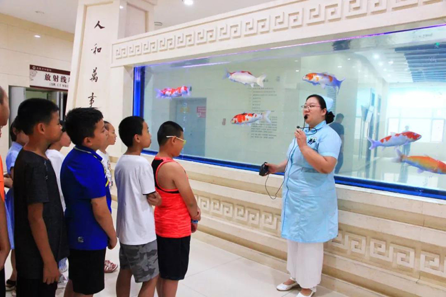 进入门诊大厅,偌大的鱼缸是那样的醒目,里面9条漂亮的锦鲤欢乐地游动。9这个数字在古代被认为是阳数中最大的数字,而水则是至阴之物,这一阴一阳,在鱼儿的游动下交融和合。鱼缸两旁写着“医患鱼水情,人和万事兴。”这也代表医院对医患和合共融的美好期许。