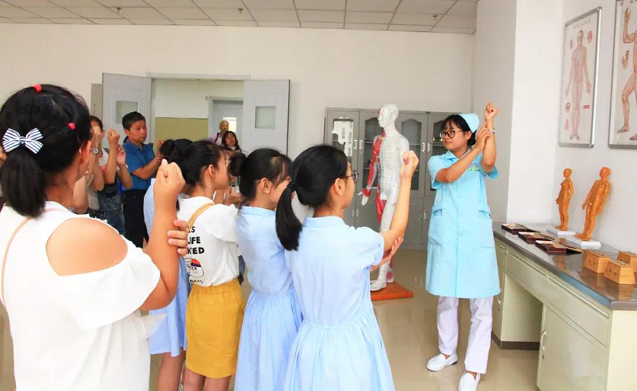 在中医护理实训室,讲解员为学生们讲解了常用的健康保健穴位以及相应的作用,同学们学得不亦乐乎。眼睛是心灵的窗口,最后,参观团的同学们来到阅览室,中医专家教做护眼操和传授护眼常识,护眼小课堂里学习气氛十分浓厚。