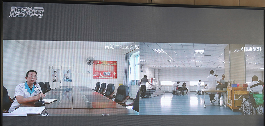 随后,康复科主任杨瑞金对《康复管理系统临床应用》进行了现场讲解,“系统可以实现整体调控,节省人力,合理安排,精准服务。并能实时采集、记录、追踪患者康复锻炼情况,全面掌握治疗的进度。”杨瑞金说。现场杨瑞金还利用这一系统,与南湖二社区医院进行视频联线,就一名在该医院康复的患者病情进行了会诊。座谈会上,与会人员就该平台的相关问题及建议进行了交流。