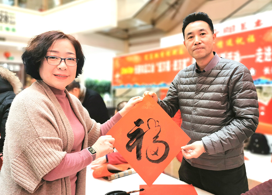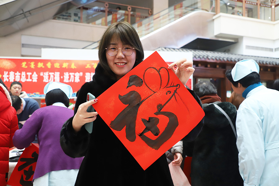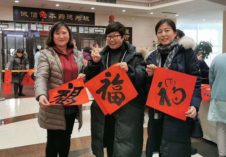一楼大厅内一派新春喜庆的气氛,由长春市总工会组织的“送万福 进万家”迎新春送春联活动正如火如荼地进行,来自长春市著名的14名书画家现场为医护人员和市民书写对联、福字。