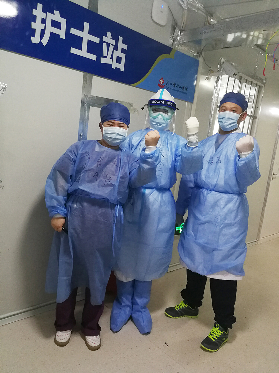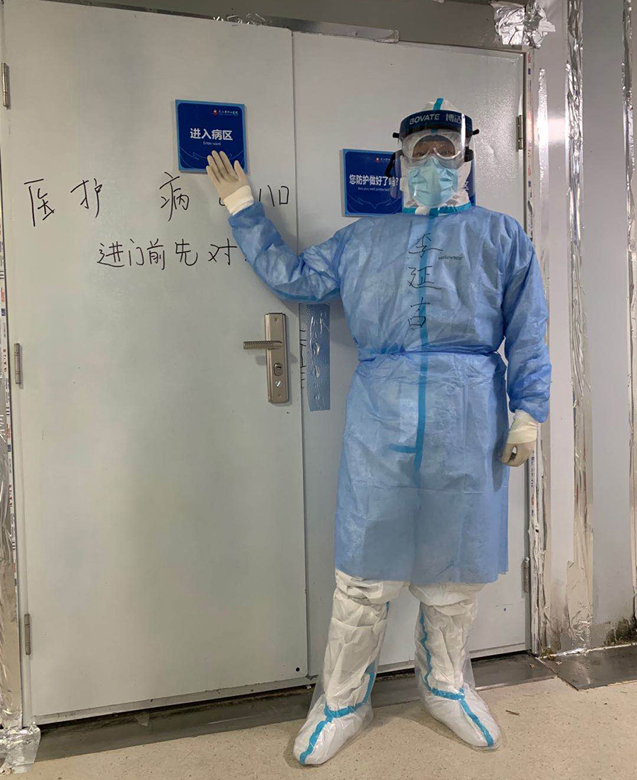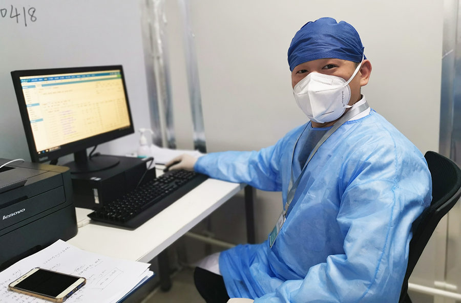 很快第一批患者入住病房,共18人,来不及多想,马上进入到救治之中。我知道,真正的战斗从这一刻开始了,说是战斗一点也不为过,我们不仅要对工作负责,每一个环节都不容一丝差错,还要对患者负责,提起十二分的精神头,每个细节都要做到极致,这也是对体力和耐力的考验。在病房里,我们需要一直穿着防护服,戴2层口罩、3层手套,整个人的呼吸都不太顺畅,如果陪患者做CT,需要前期准备、穿上防护服、进病房领患者、出病房脱防护服,整个过程需要一个小时,防护服里的衣服经常是湿的。