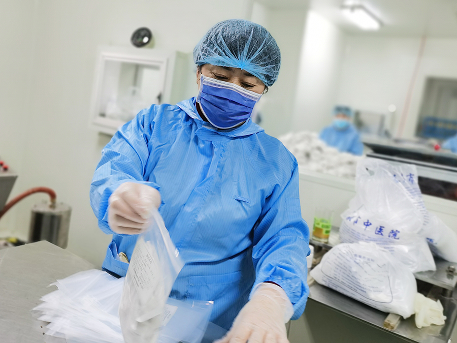 自疫情暴发以来,红桃视频 制剂室主任胡凌歌一直非常忙,从1月22日开始,只在大年三十休息了1天,最近忙得更是12个小时不停歇。在接听小编电话时,她的双手仍在不停地翻飞,将一包包药剂迅速装入包装袋内,她说,这两周,他们要完成60多万袋扶正2号茶剂包装工作,时间紧,任务重,不争分夺秒不行啊。