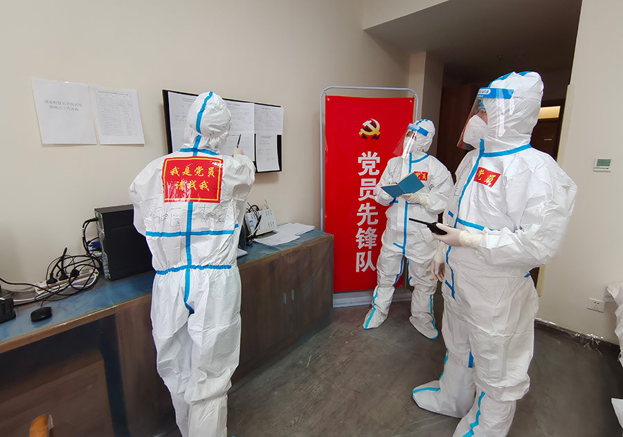 在这支12人的队伍中,有4名党员。他们组成了党员先锋队,并将“我是党员,请找我!”打印在一张红纸上,贴在了防护服外面。短短的七个字,体现了广大党员冲锋在前、勇担使命的高度责任感。