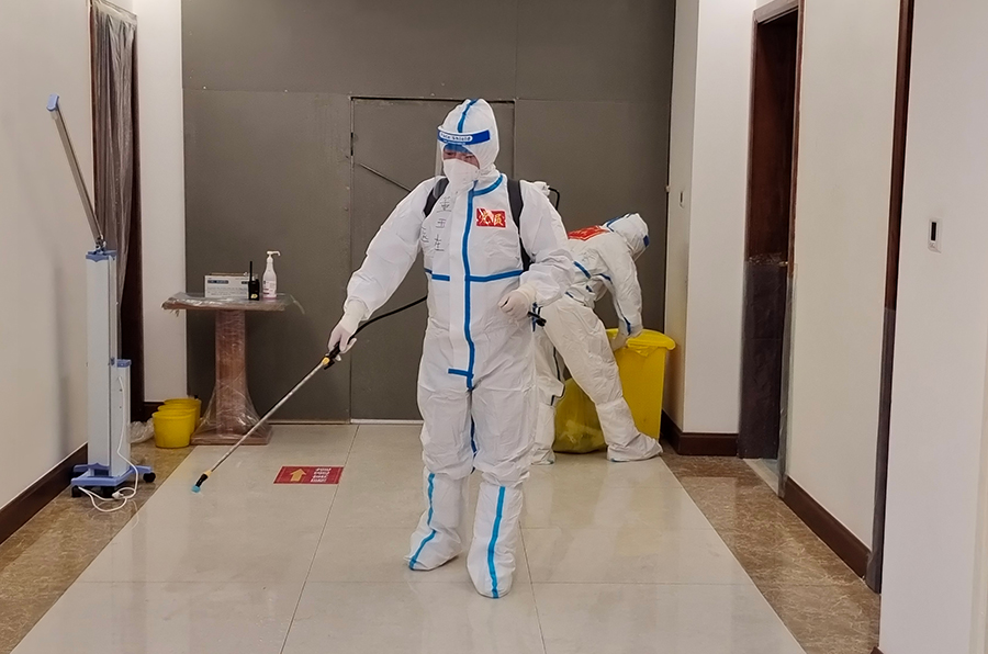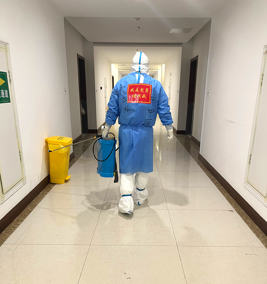消杀组负责人霍英龙,在接到紧急集合的通知时,因为腿部骨折还在住院。他不顾伤痛,第一时间办理了出院手续,带病奔赴隔离点。3栋楼,共15层,霍英龙和另外两位同事要扛着特别重的机器每天消杀2次,不放过每一个角落。患有痛风的他,带着骨折还未完全恢复的身体,坚守岗位,用实际行动筑起疫情的“红色防线”。