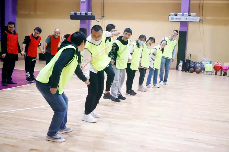 游戏“团结向前”:每队队员手牵手站成一排,传递呼啦圈,过程中手不可以松开,速度最快的队员得分最高,该游戏充分展示了个人的身体协调性和团队协作能力。“快,快,快...咱们队马上就第一名了,这可是拉开积分的好时机啊”。