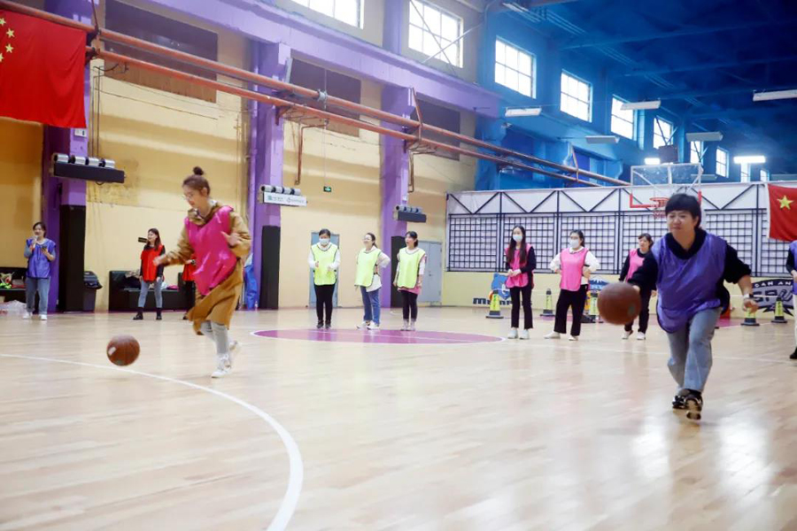游戏“运球接力”:游戏中,女队员们也很不甘示弱,她们有节奏地带球跑,让男队员们也很惊讶,“加油!加油!就差最后一人了。”双方你来我往,节奏感超强。