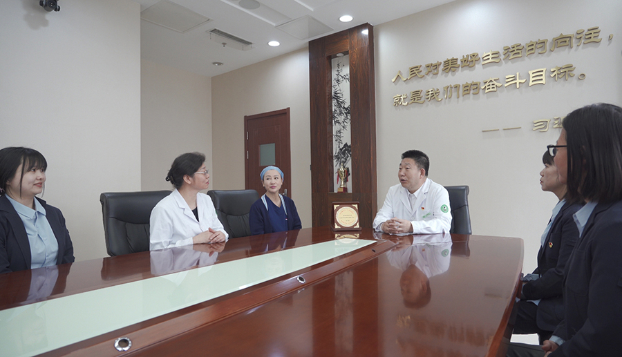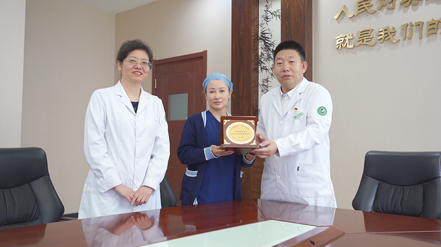 周艳副书记握着周洁的手说:“医院无论何时都是退休职工的坚强后盾,‘家’的大门永远为大家敞开,希望能常回‘家’看看。”