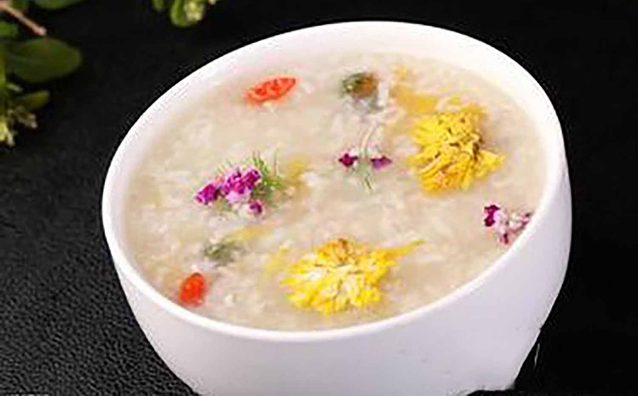 【材料】鲜枸杞子100克(干品20克),菊花10克,粳米200克,豆豉汁、精盐、味精、麻油各适量。