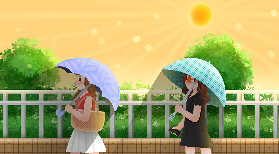 小暑时节,热浪滚滚。大家外出时一定要做好防暑准备,带好遮阳伞、遮阳帽、太阳镜等,涂抹防晒霜,随身备好饮用水,并尽量避开10时—15时太阳火辣时外出。