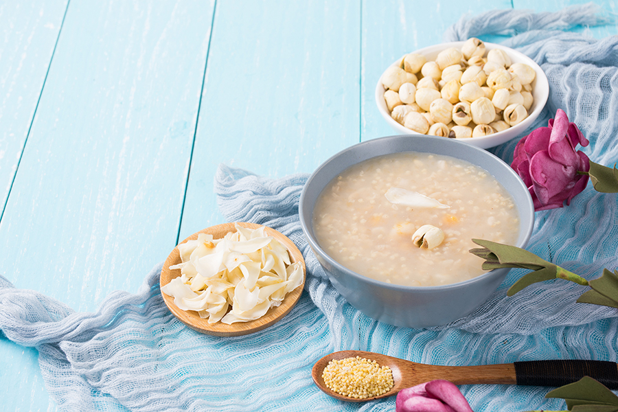 【材料】大米150克、百合干25克、莲子25克、枸杞15克、冰糖30克。