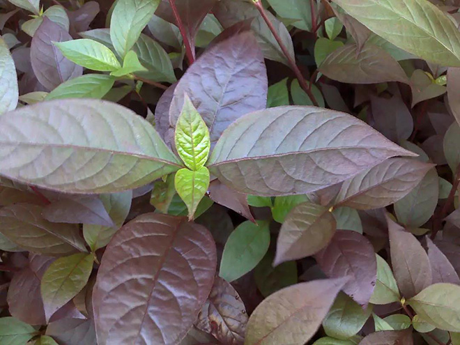 叶片多皱缩卷曲、破碎,完整者展平后呈卵圆形,长4~11cm,宽2.5~9cm。先端长尖或急尖,基部圆形或宽楔形,边缘具圆锯齿。两面紫色或上表面绿色,下表面紫色,疏生灰白色毛,下表面有多数凹点状的腺鳞。叶柄长2~7cm,紫色或紫绿色。质脆。带嫩枝者,枝的直径2~5mm,紫绿色,断面中部有髓。气清香,味微辛。