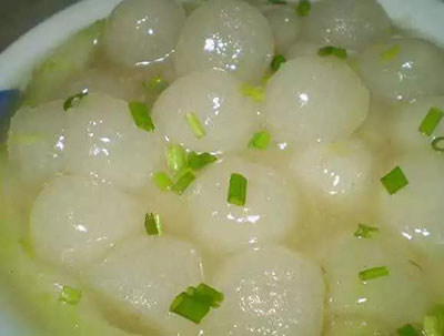 【做法】冬瓜去皮,洗净削成见圆小球,入沸水略煮后,倒入冷水使之冷却。将冬瓜球排放在大碗内,加盐、味精、鲜汤上笼用武火蒸30分钟取出。把冬瓜球复入盆中,汤倒入锅中加炼乳煮沸后,用水淀粉勾芡,冬瓜球入锅内,淋上香油搅拌均匀,最后撒上火腿末出锅即成。