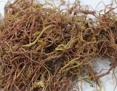 性状鉴别:本品根茎呈不规则块状,大小不一,顶端有茎、叶的残基;质稍硬。根茎簇生多数细根,长3~15cm,直径0.1~0.3cm,多编成辫状;表面紫红色或灰红色,有纵皱纹;质较柔韧。气微香,味甜、微苦。