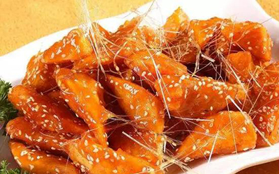 【做法】将山药削皮洗净,切成滚刀块,备用。植物油烧至五成热,把山药放入油内炸透,至金黄色,捞出,控净余油。用清水将白糖化开,用慢火炒至白糖由稠变稀,能拔丝时,倒入山药,离开火眼,颠翻炒匀,使糖汁完全粘在山药上后,倒在抹香油的盘子内即可。